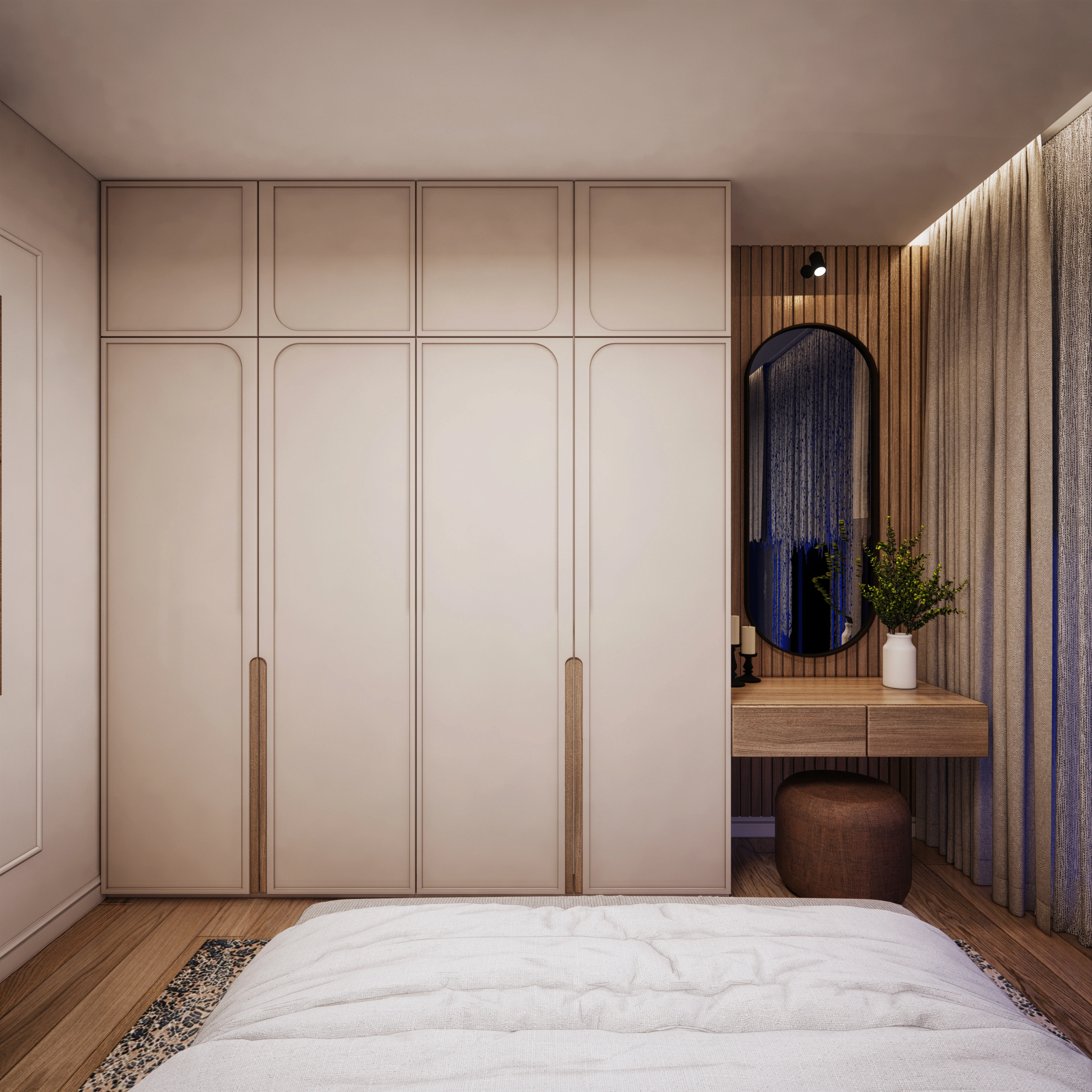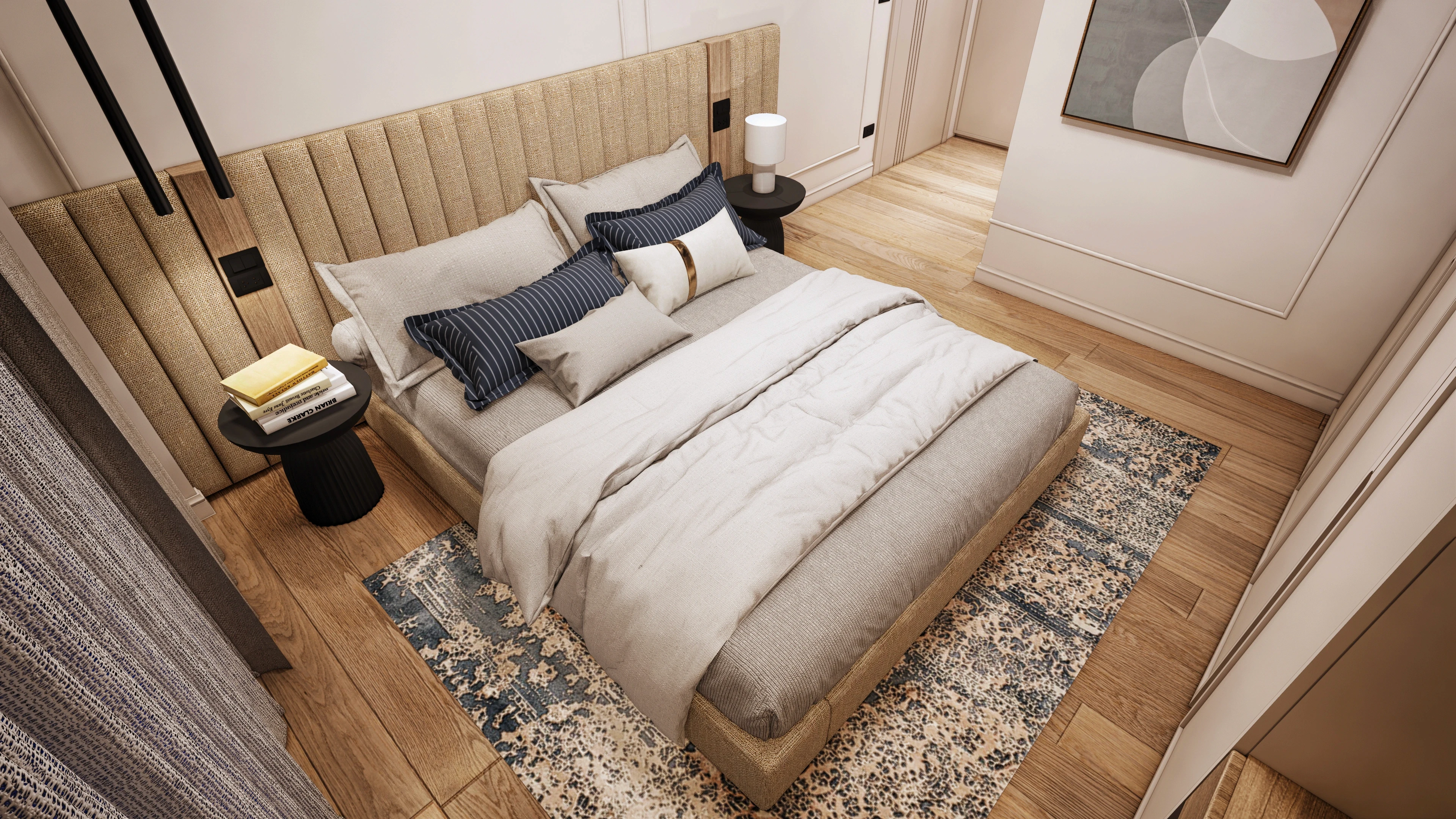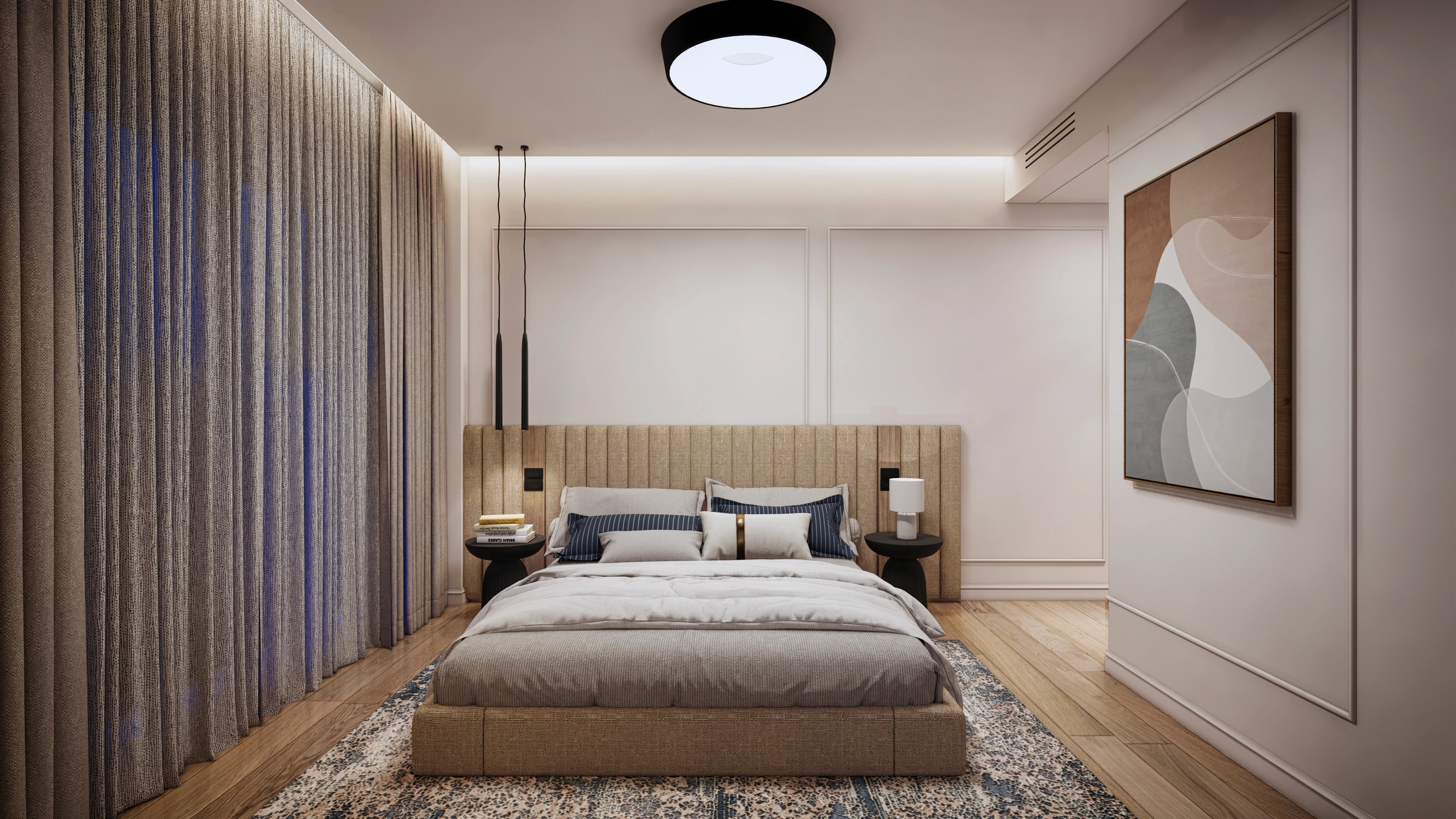 Цялостният интериор на дома е обединен от единна концепция, като за всички помещения са подбрани леки неутрални тонове и естествени материали. Този подход създава усещане за спокойствие и приемственост. Балансът между интензивността на цветовете и сложността на текстурите е прецизиран спрямо функцията и спецификата на всяка стая, което гарантира последователен, хармоничен и съобразен с нуждите на обитателите дизайн.