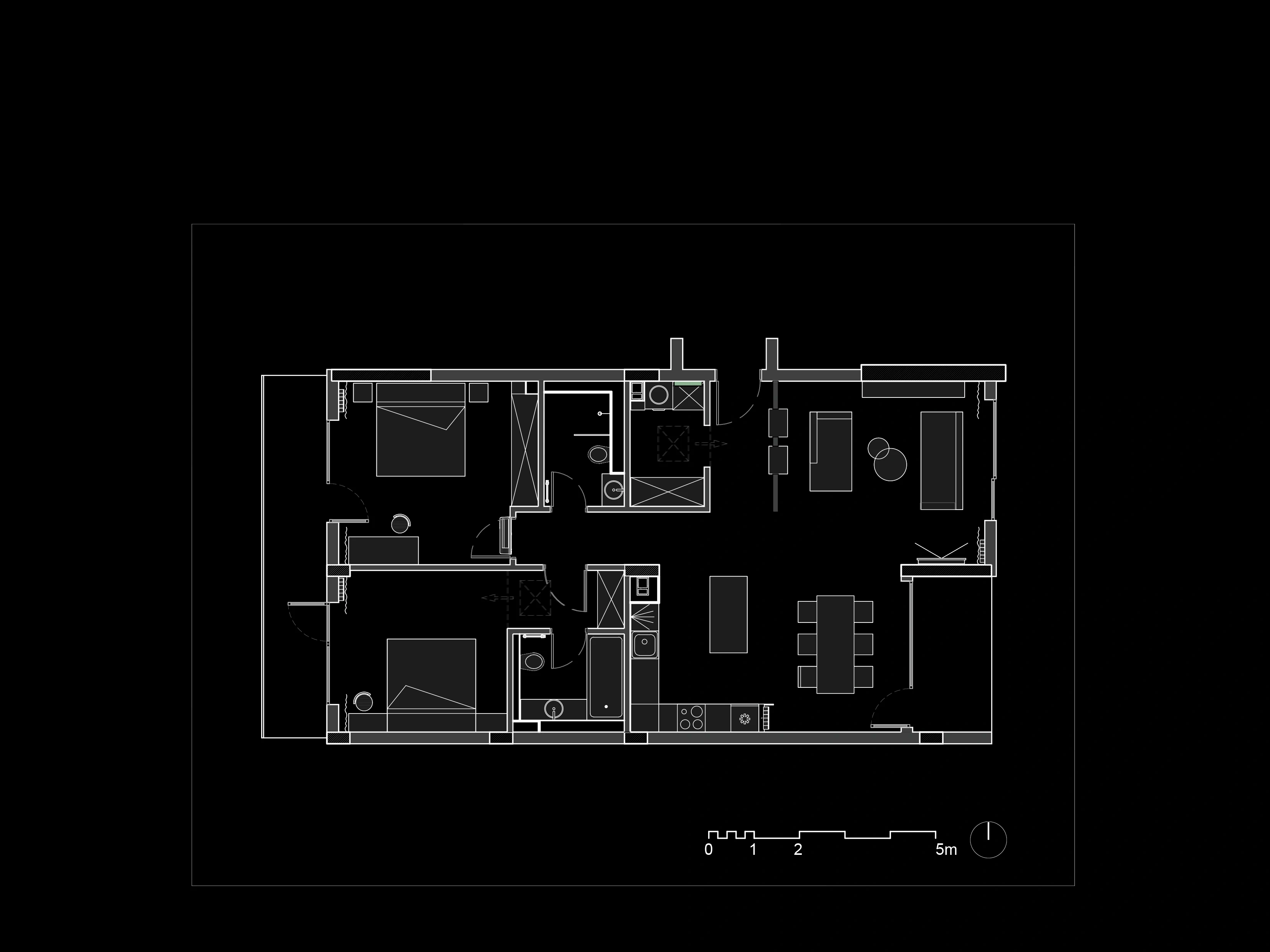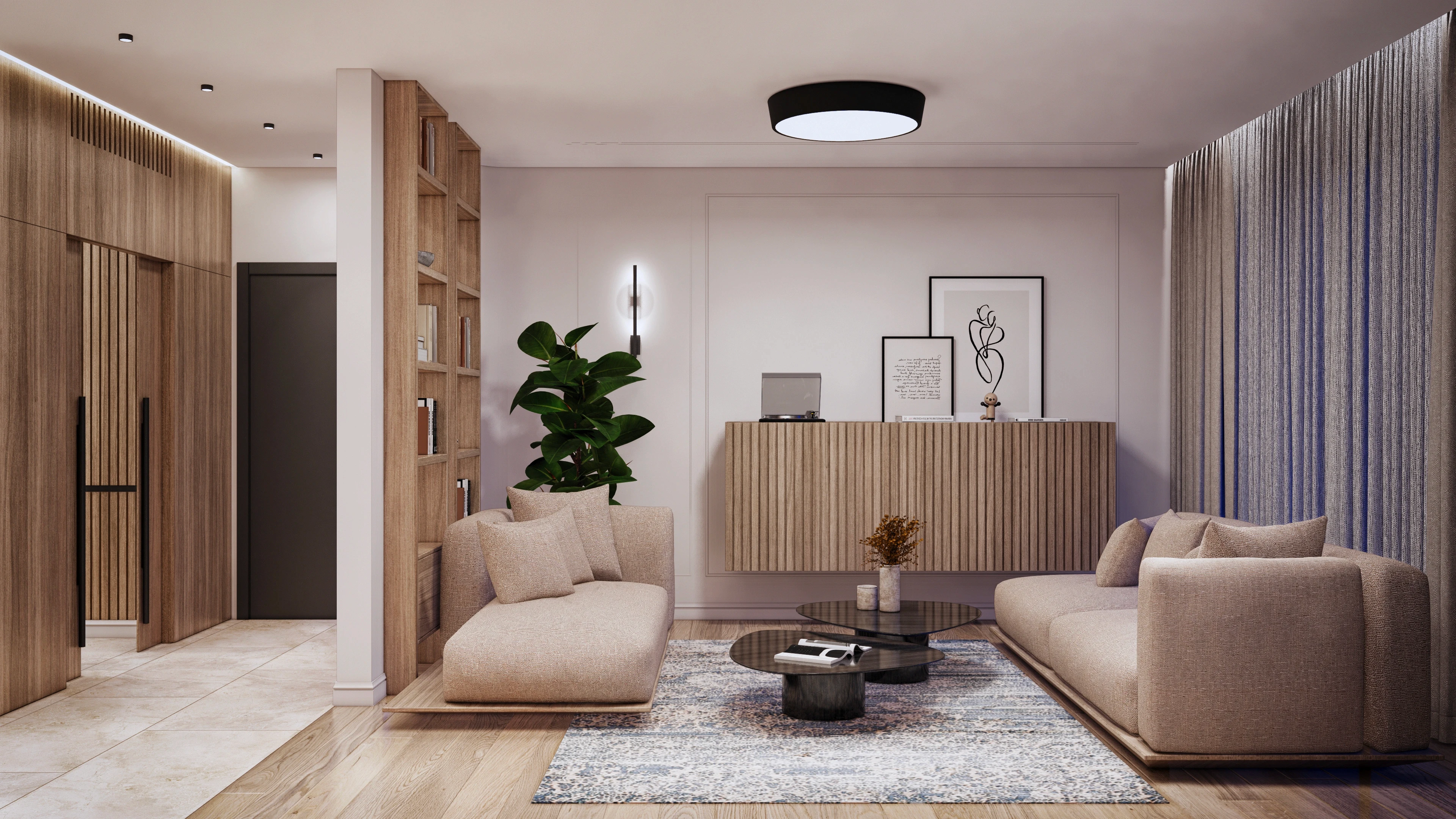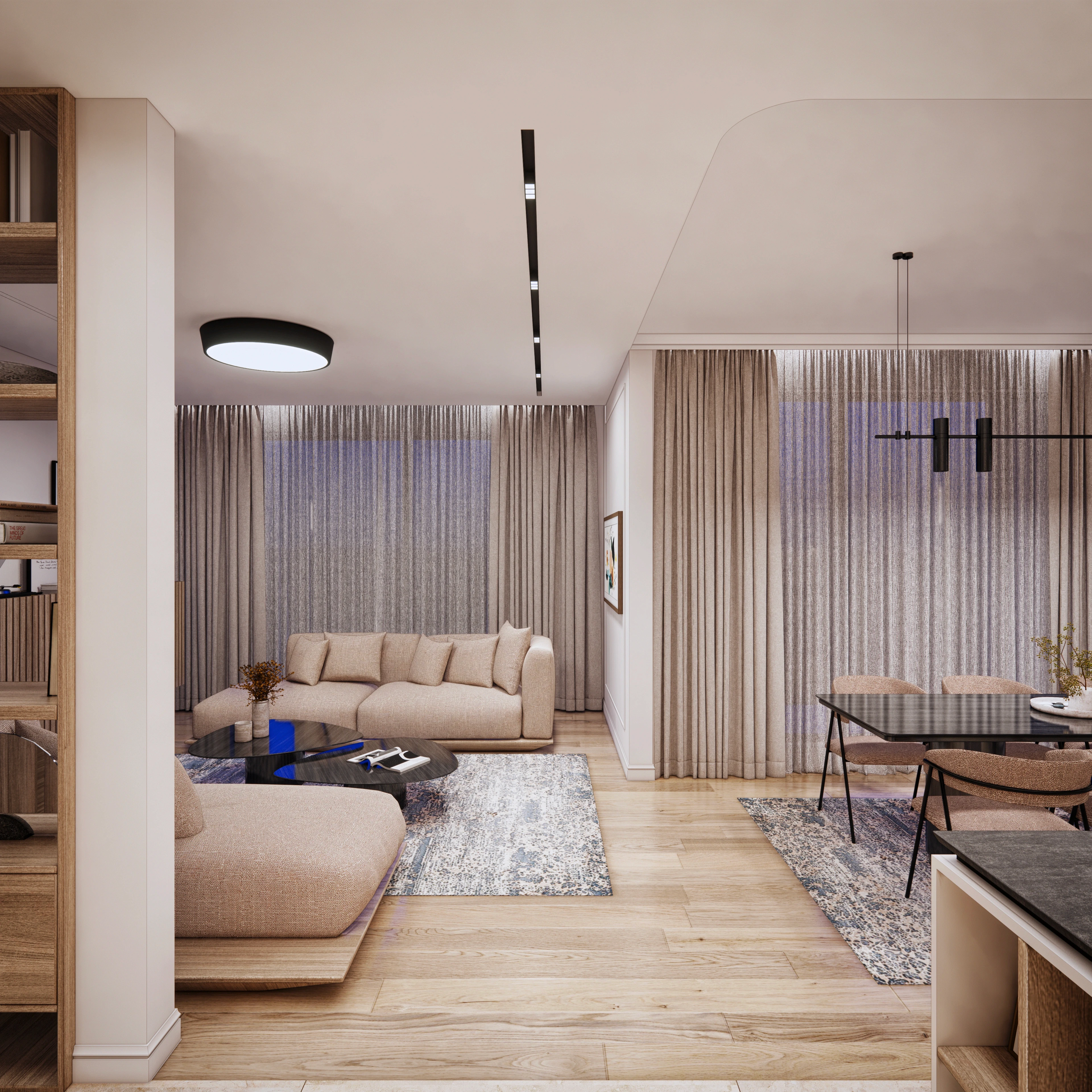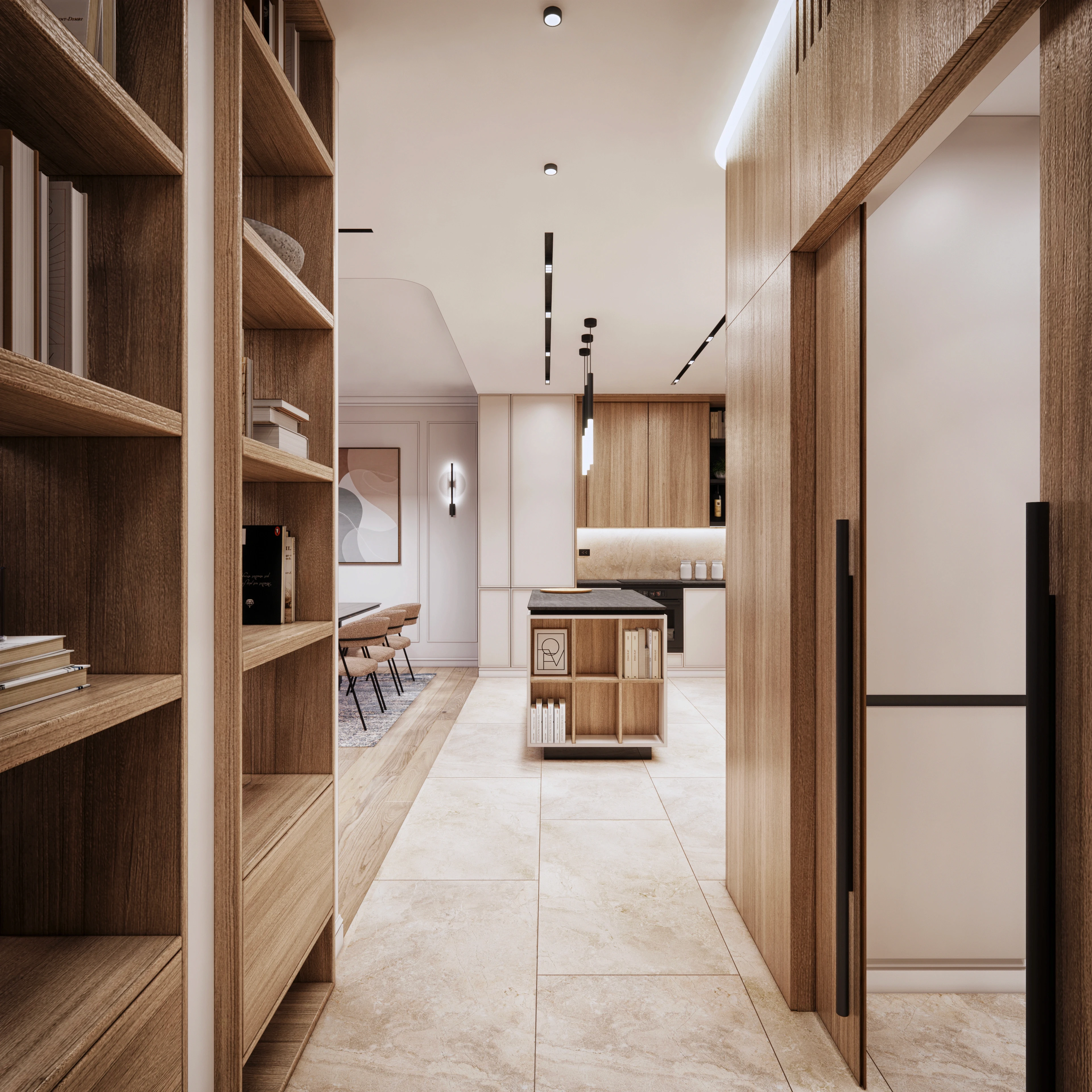 Г-образната форма на помещението и интелигентното зониране създават ясно функционално разделение, като същевременно запазват усещането за простор. Входът е елегантно интегриран в дневната и е визуално отделен с висока библиотека, което позволява на естествената светлина да достига до входното пространство.