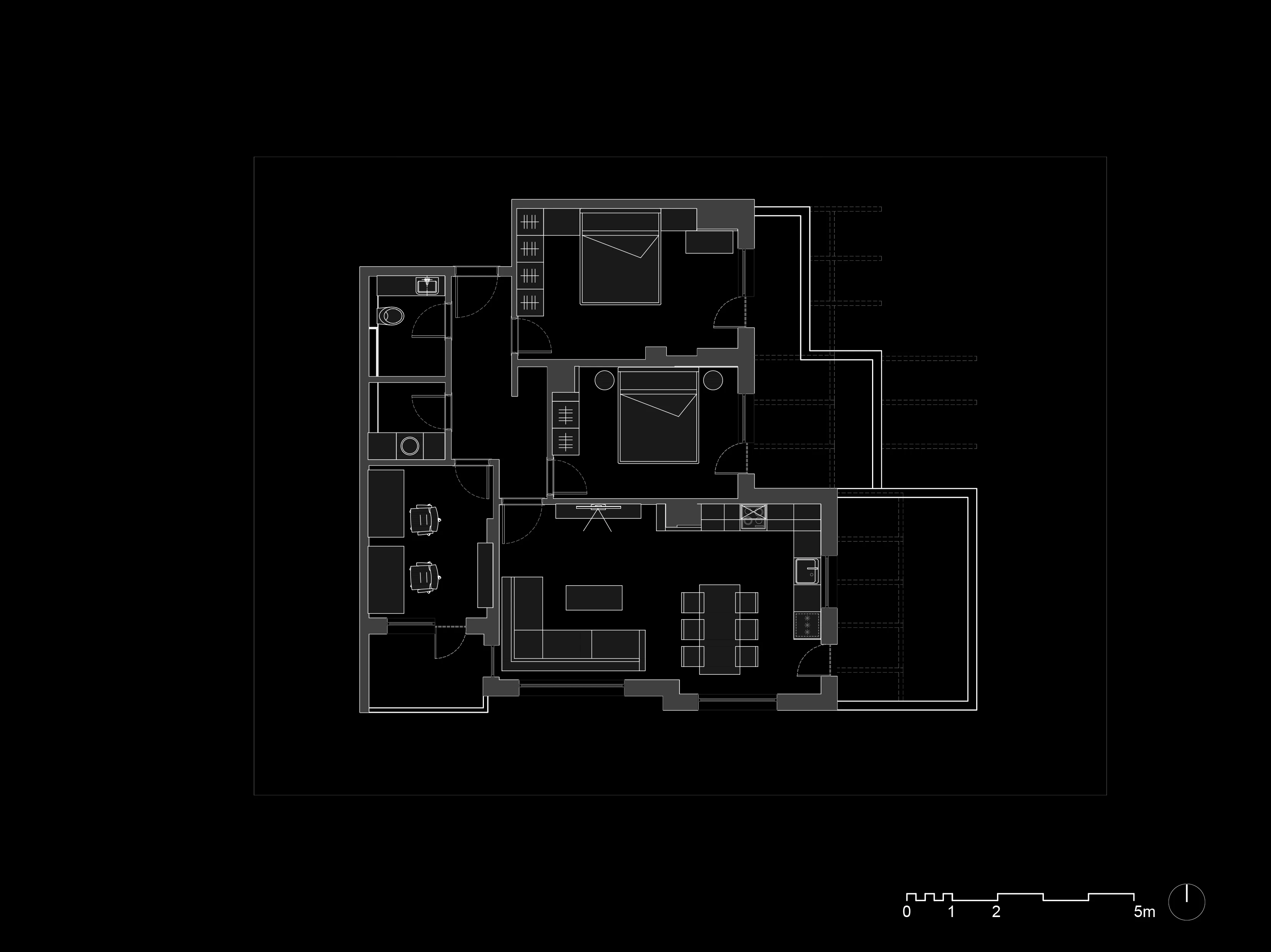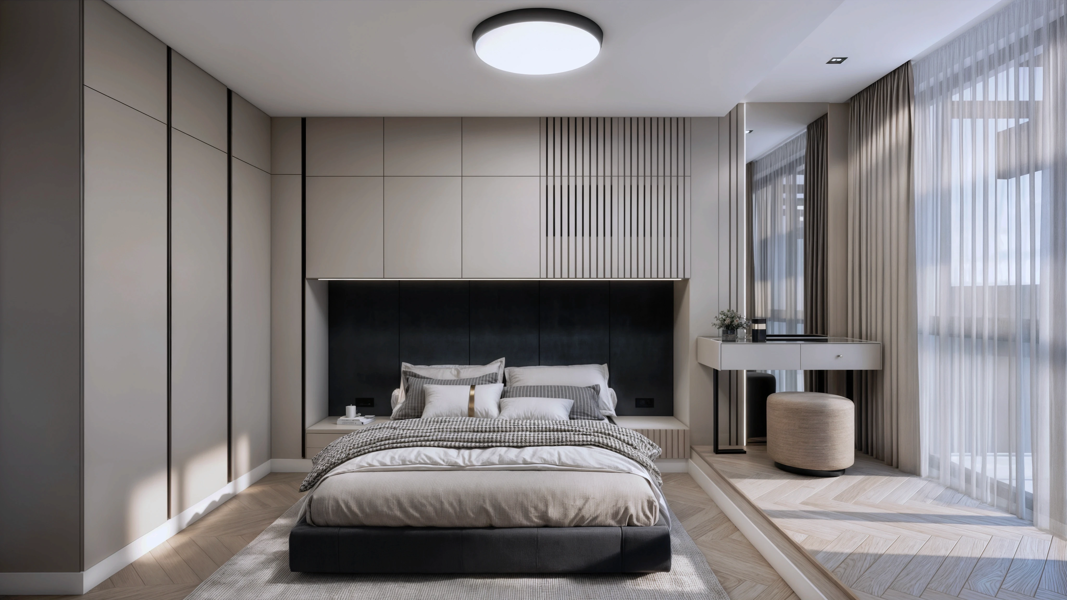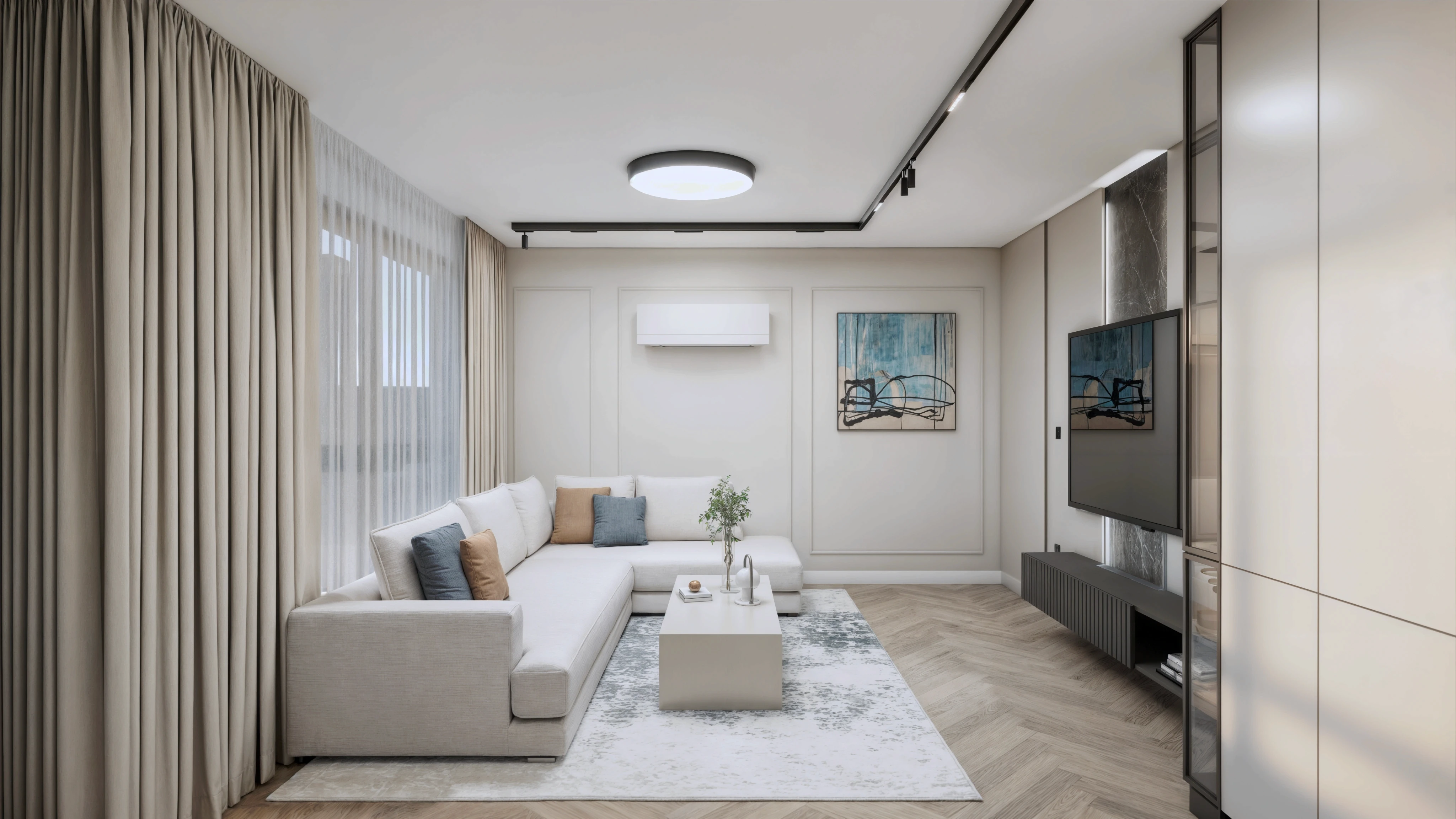 Интериорът на дома е обединен от обща концепция, базирана на леки неутрални тонове. Те създават усещане за спокойствие и приемственост. Прецизният баланс между цветове и текстури във всяка стая гарантира последователен и хармоничен дизайн, който отразява нуждите на обитателите.