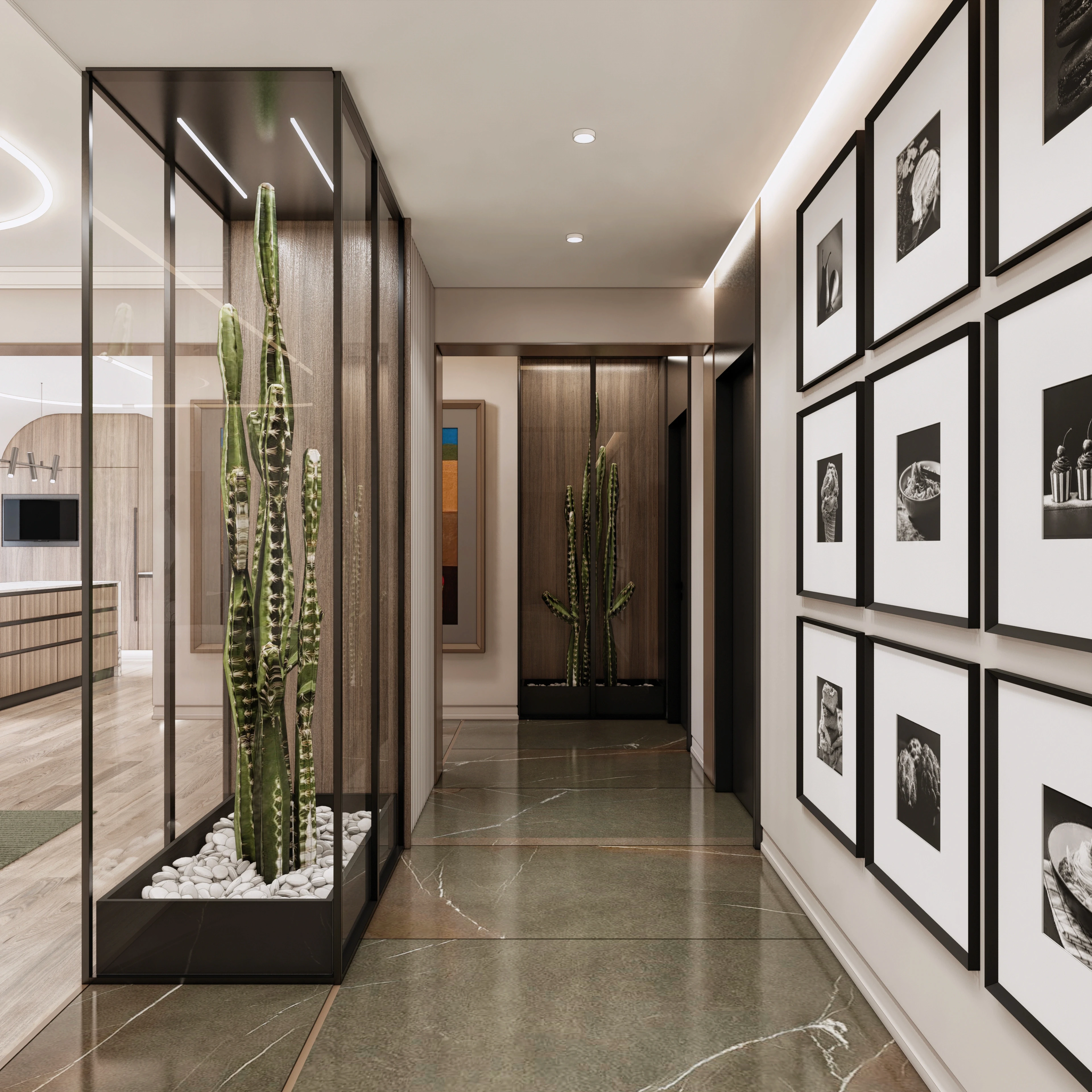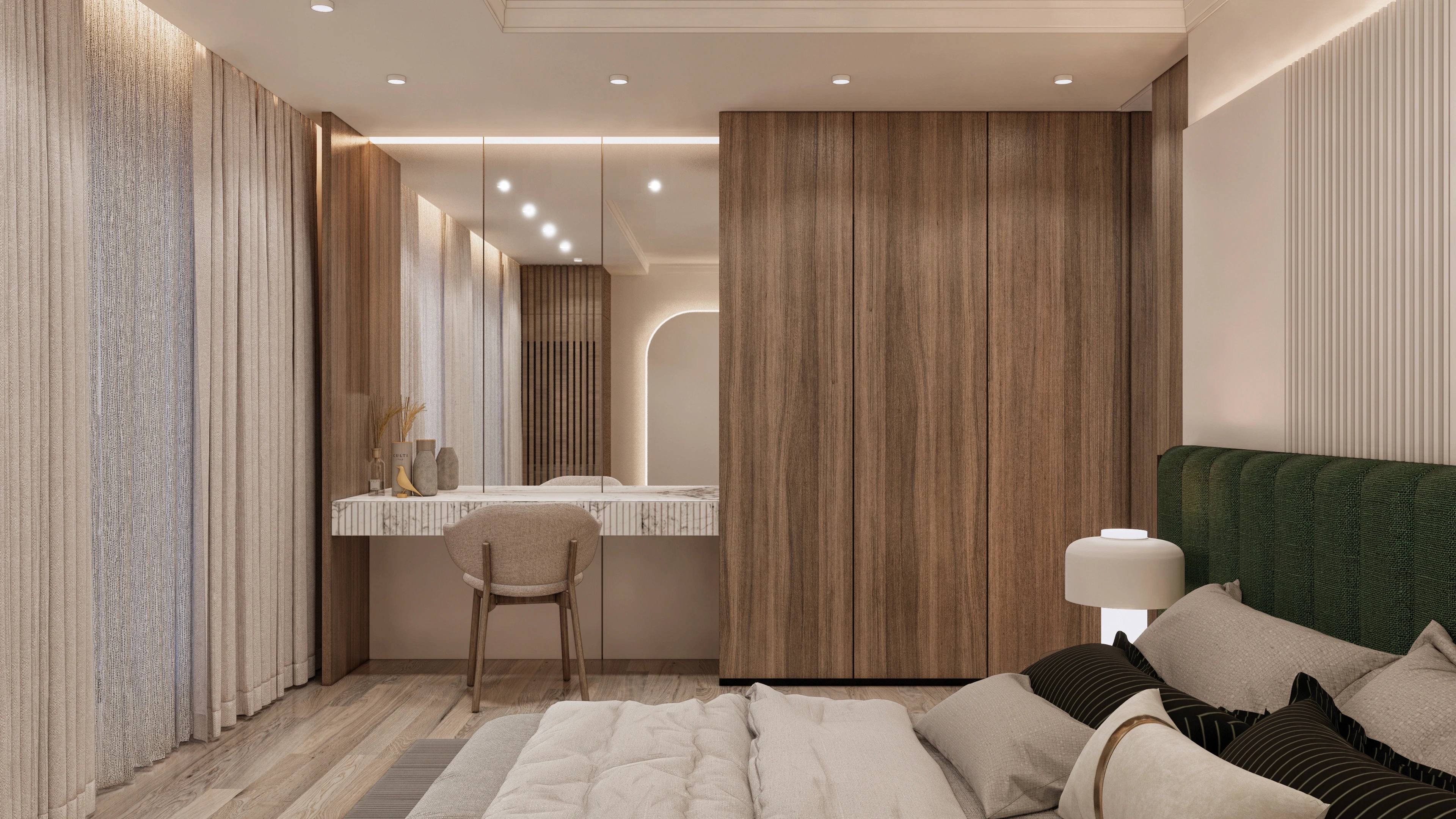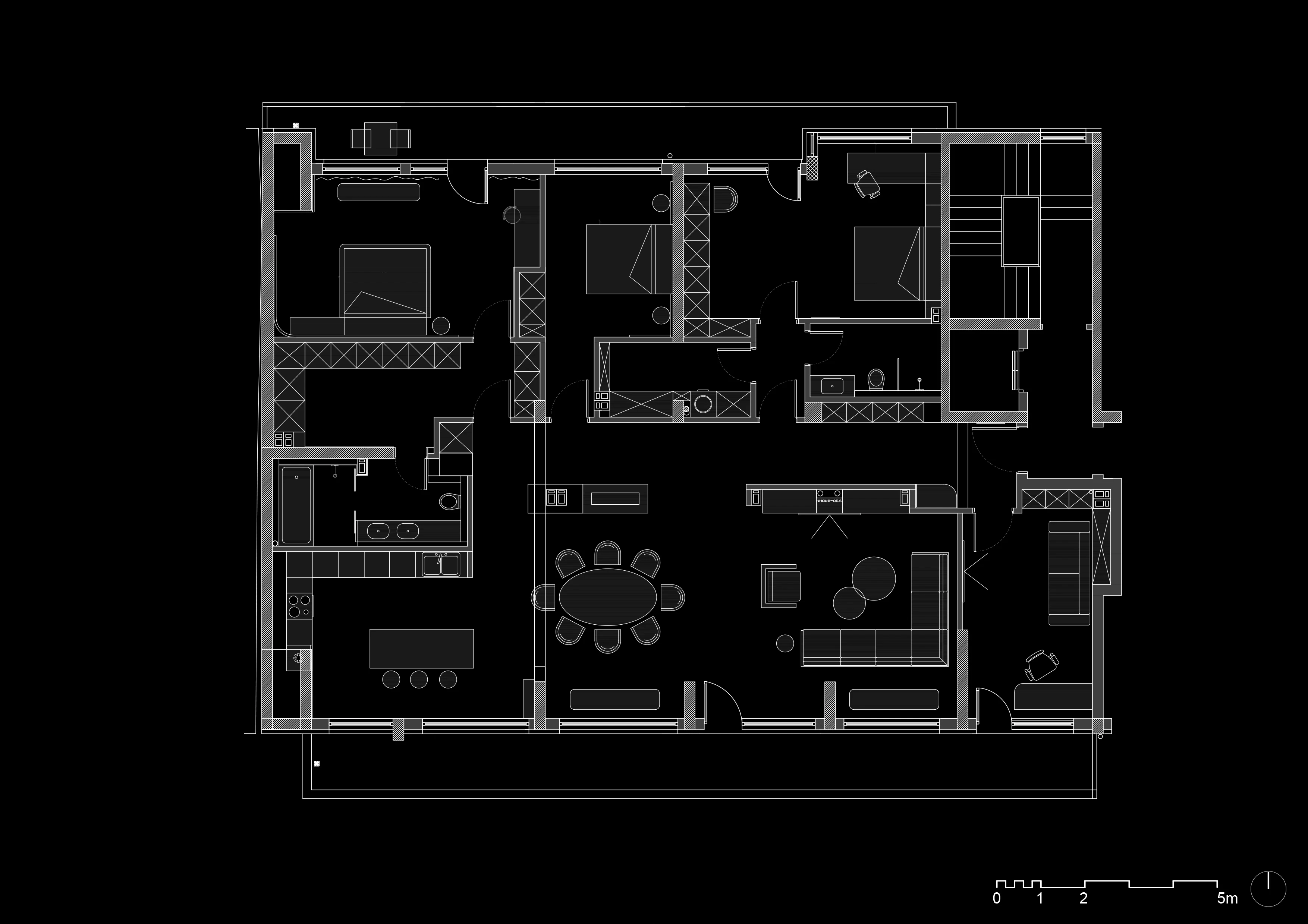 Ключов аспект на проекта е изцяло новото функционално разпределение на апартамента. Това ни позволи да създадем пространства, които са не само естетически издържани, но и изключително практични. За да оптимизираме всеки квадратен метър, интегрирахме голям брой скрити шкафове и гардероби, които осигуряват максимална ефективност, без да нарушават визуалната чистота на интериора.