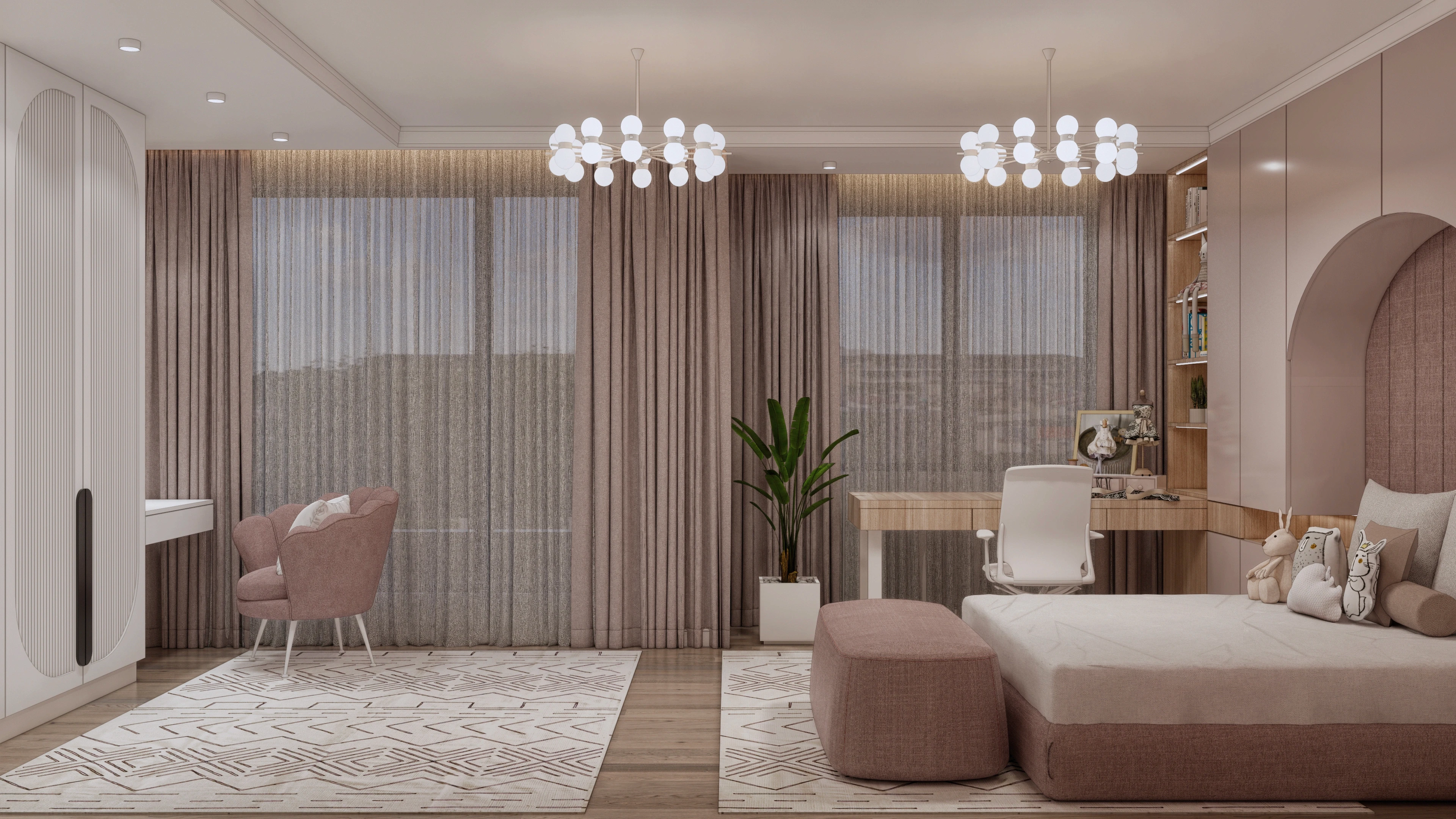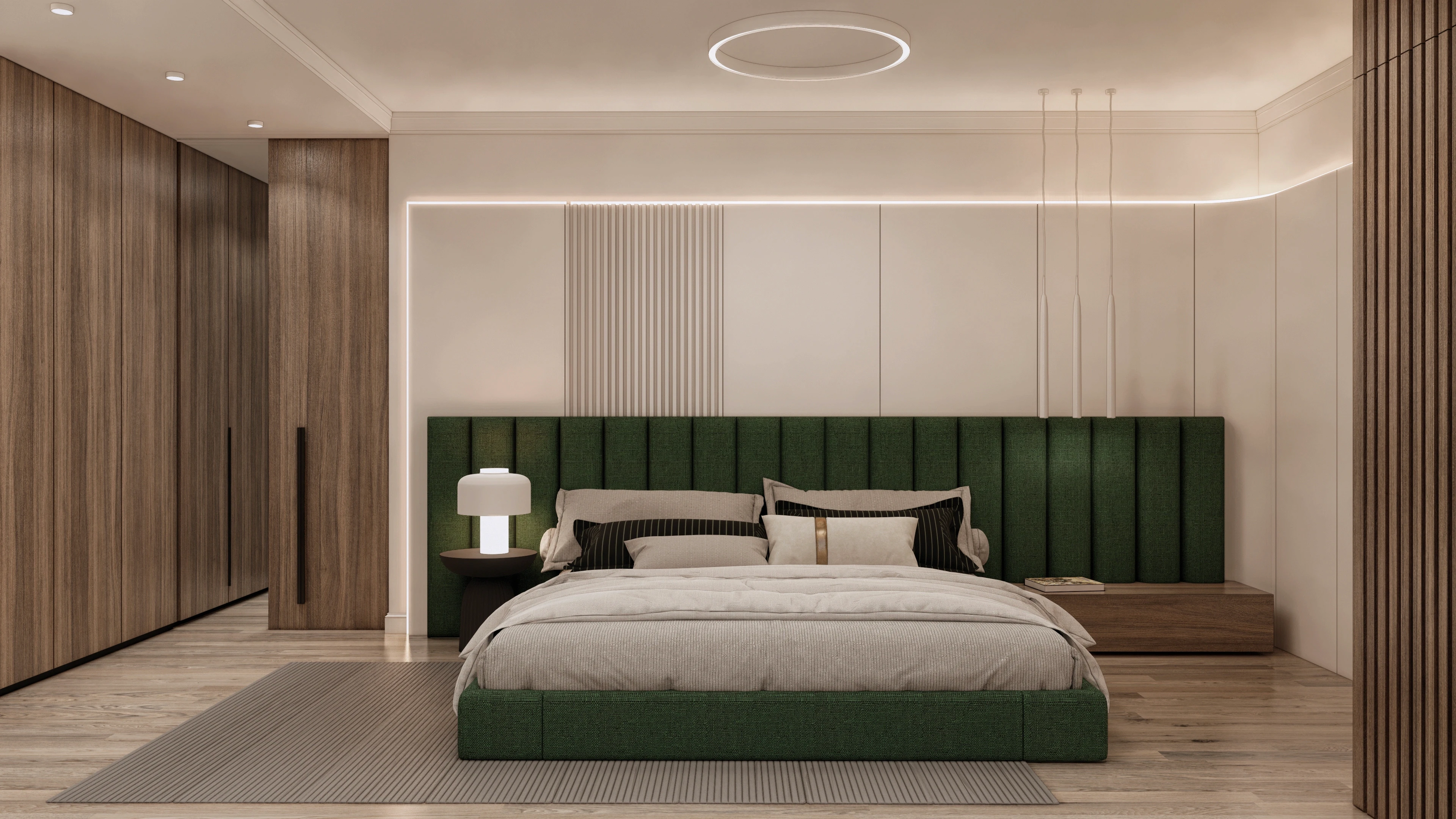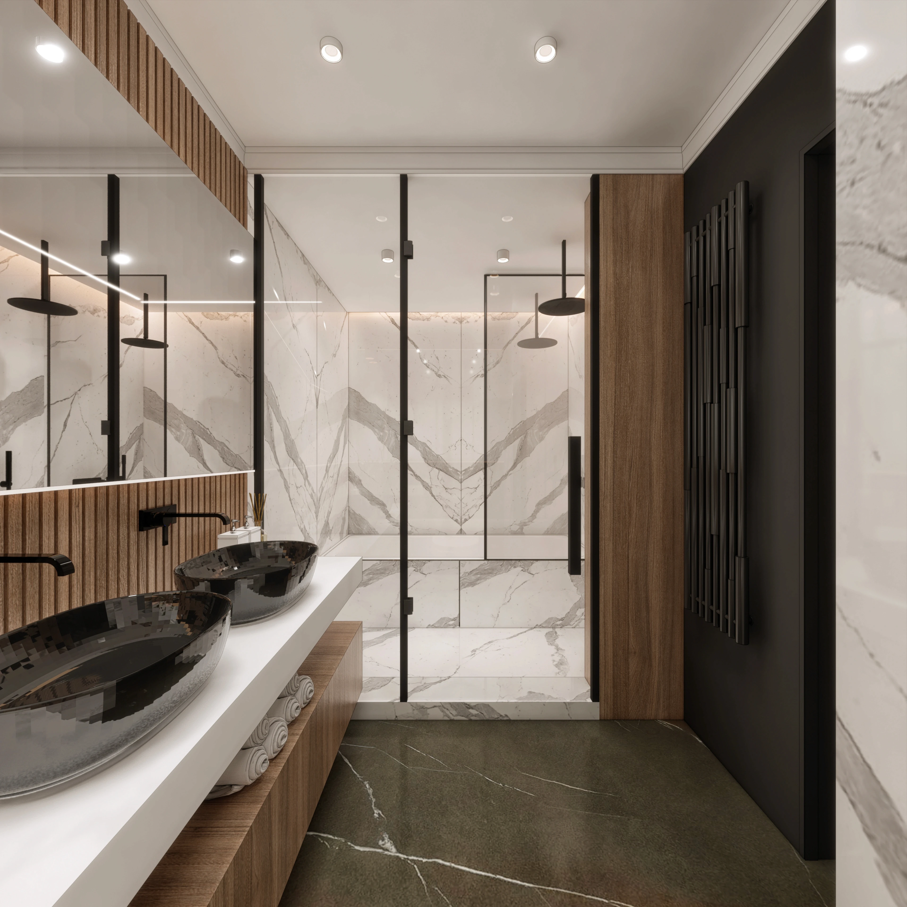 Ключов аспект на проекта е изцяло новото функционално разпределение на апартамента. Това ни позволи да създадем пространства, които са не само естетически издържани, но и изключително практични. За да оптимизираме всеки квадратен метър, интегрирахме голям брой скрити шкафове и гардероби, които осигуряват максимална ефективност, без да нарушават визуалната чистота на интериора.