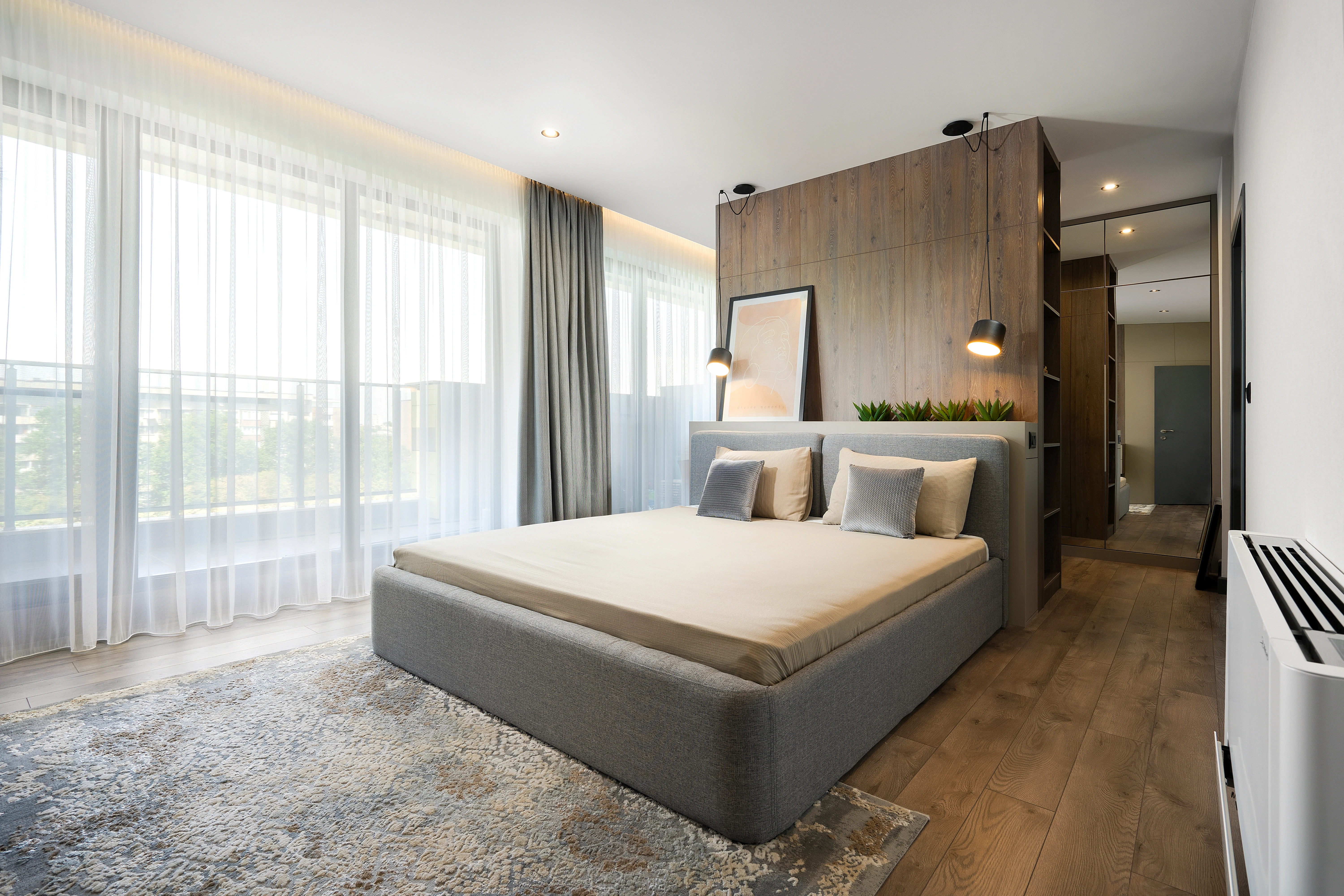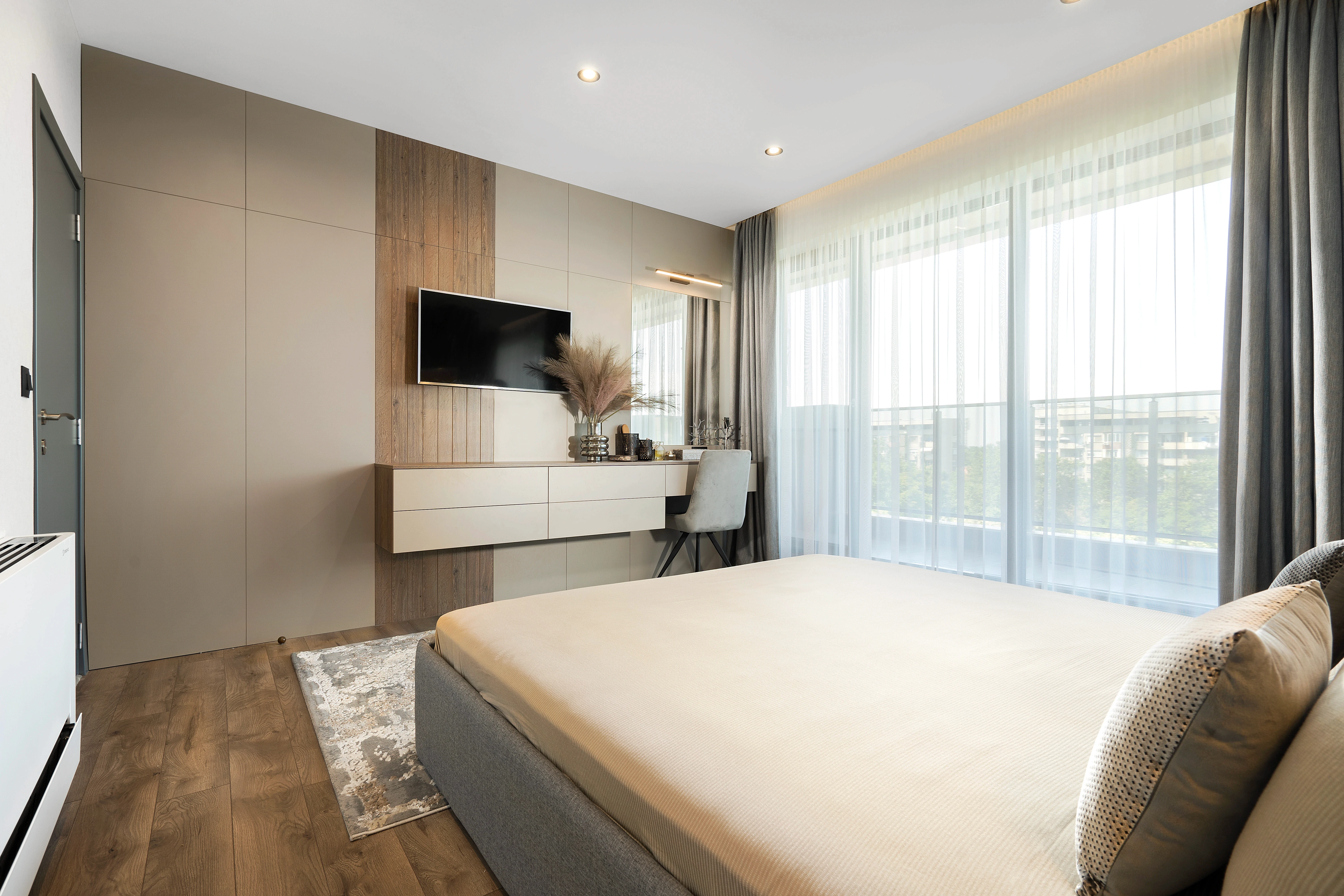 Характерен момент в проекта е обширната родителска спалня с плуващо в пространството легло и обособен будоар. Покривната тераса, обграждаща апартамента от всички страни, осигурява страхотни гледки към Родопите, както и допълнителни пространства за детски кътове, барбекю и зимна градина.