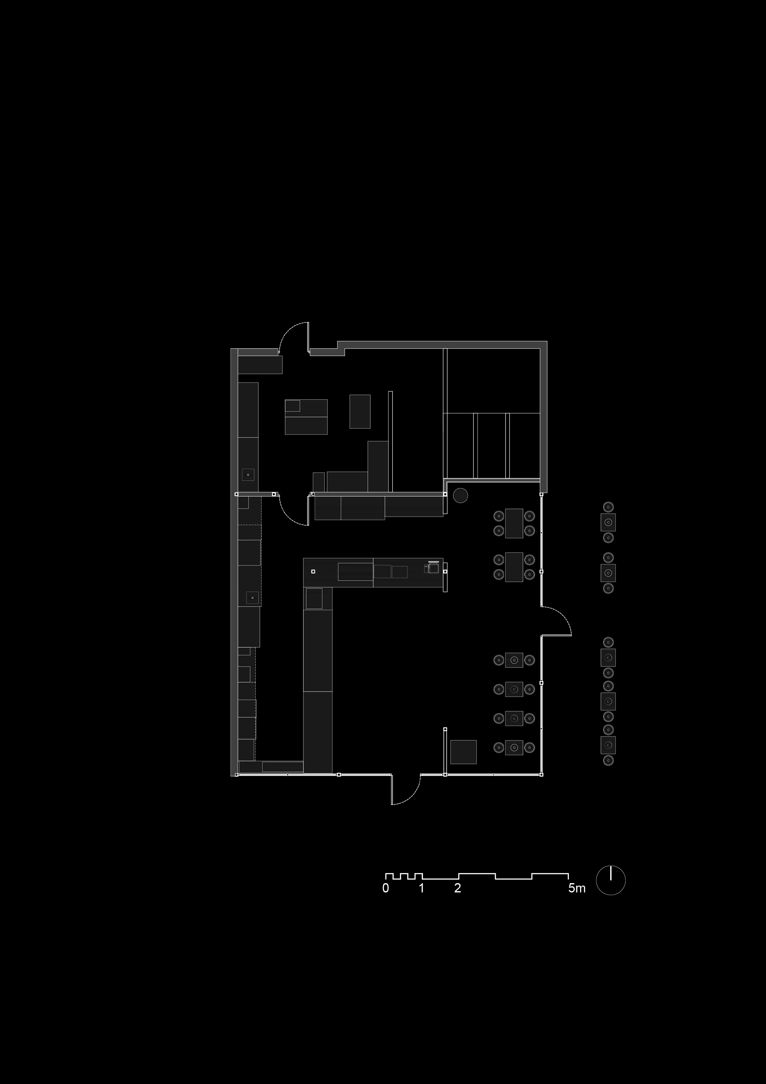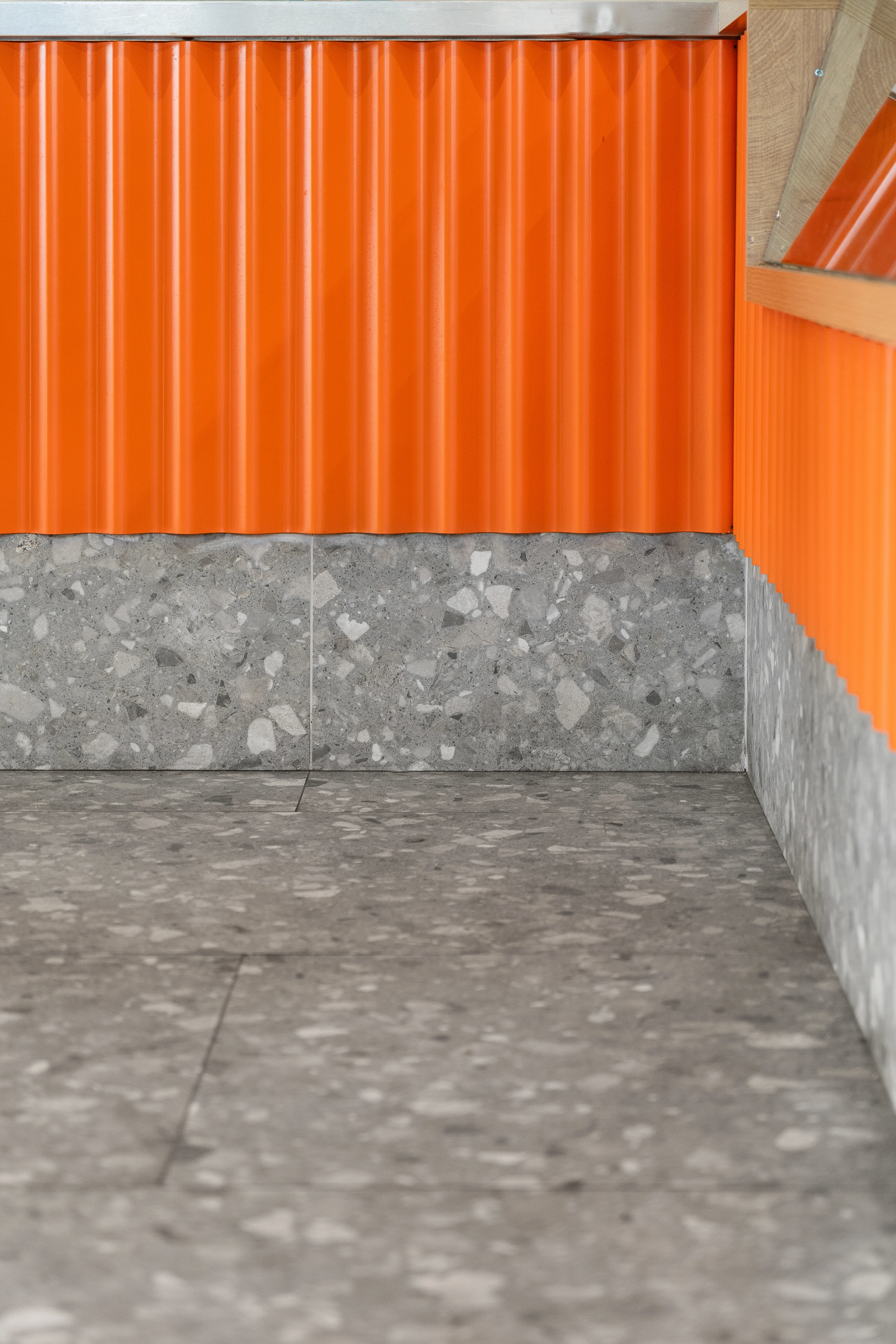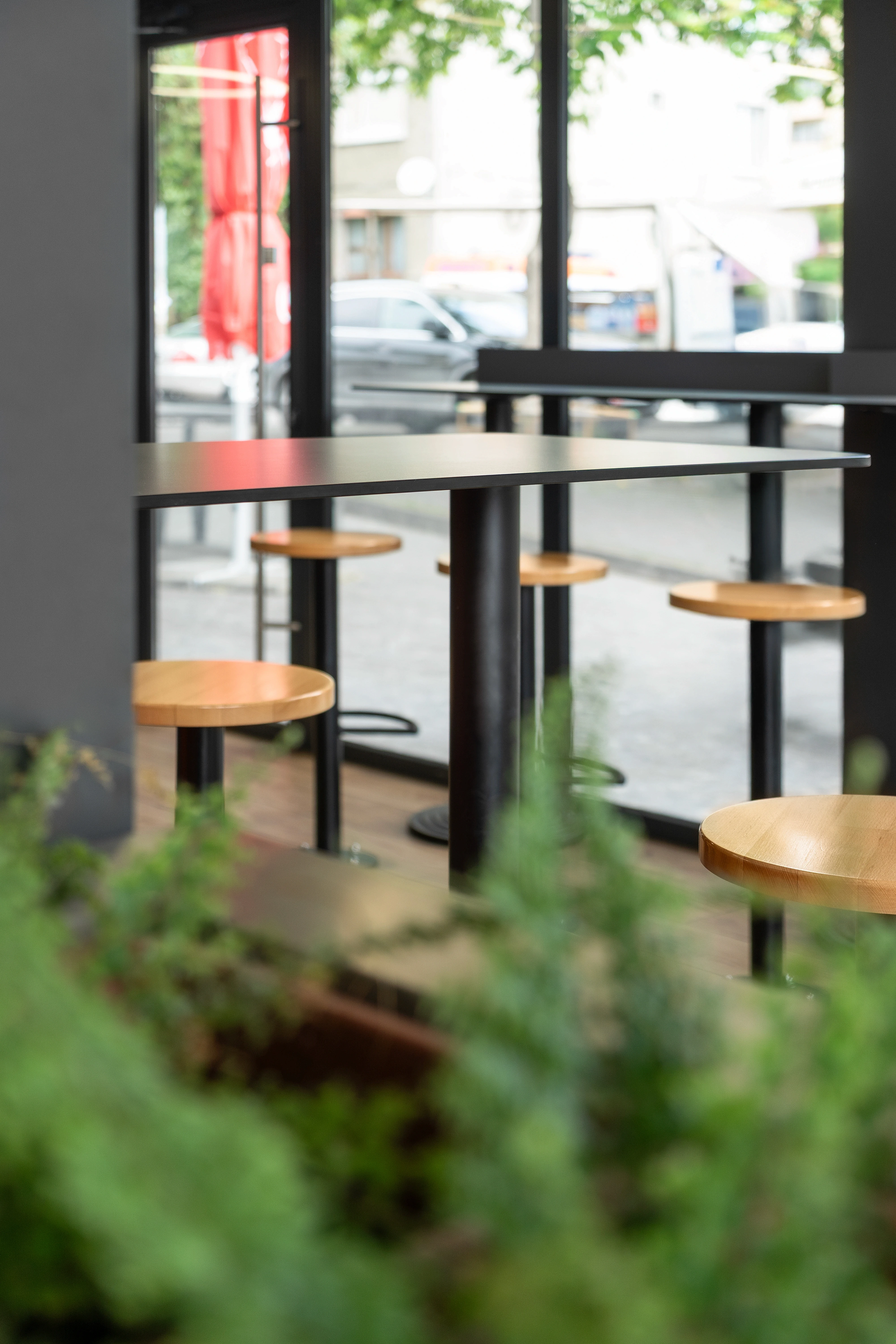 Интериорът е силно функционален. Използвахме индустриален стил с ярко оранжеви метални елементи като ключов визуален и навигационен акцент. Приложихме зеленина за меко и ясно зониране между зоната за поръчки и зоната за хранене. Оформлението осигурява прави и ясни ходови линии за максимална ефективност.