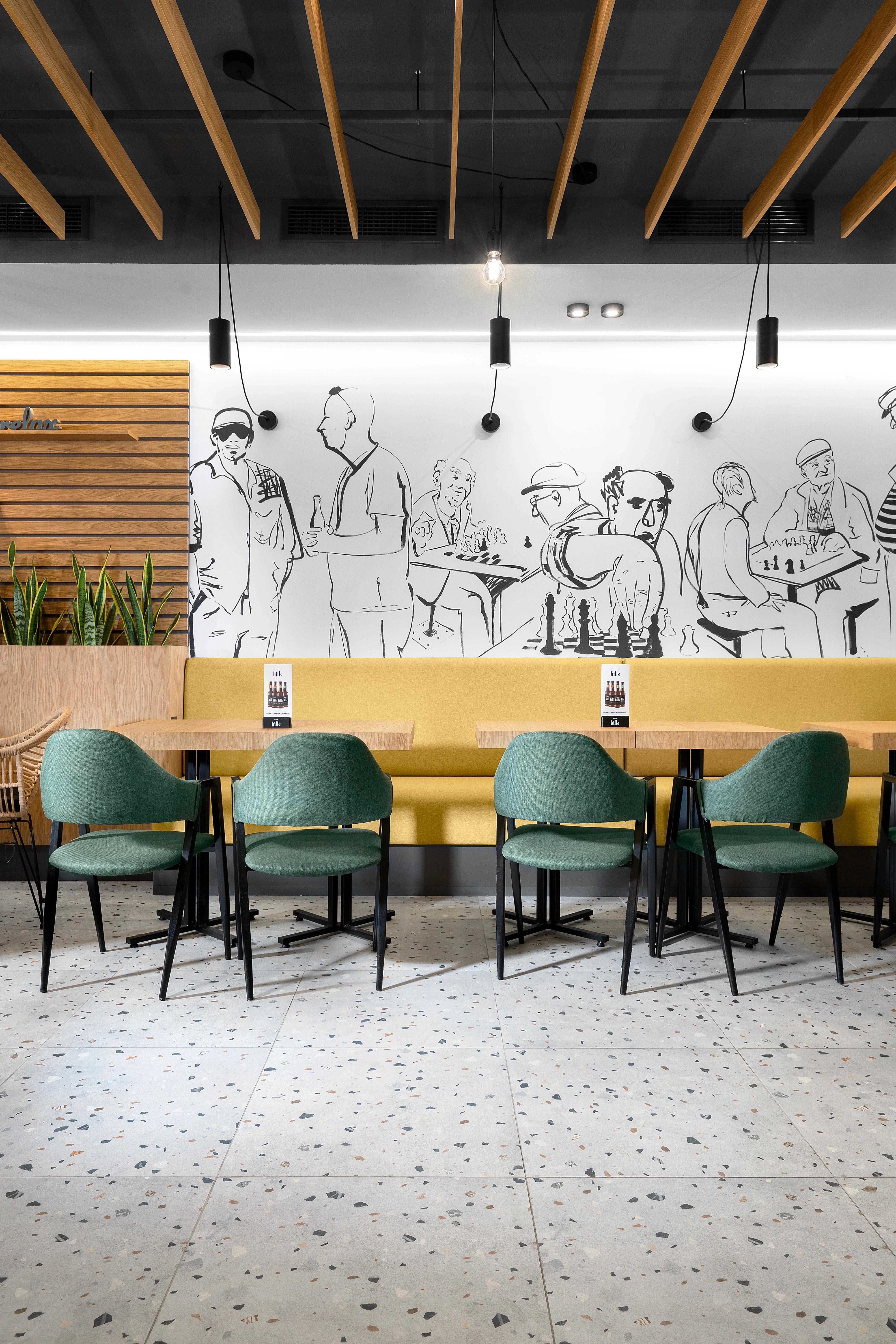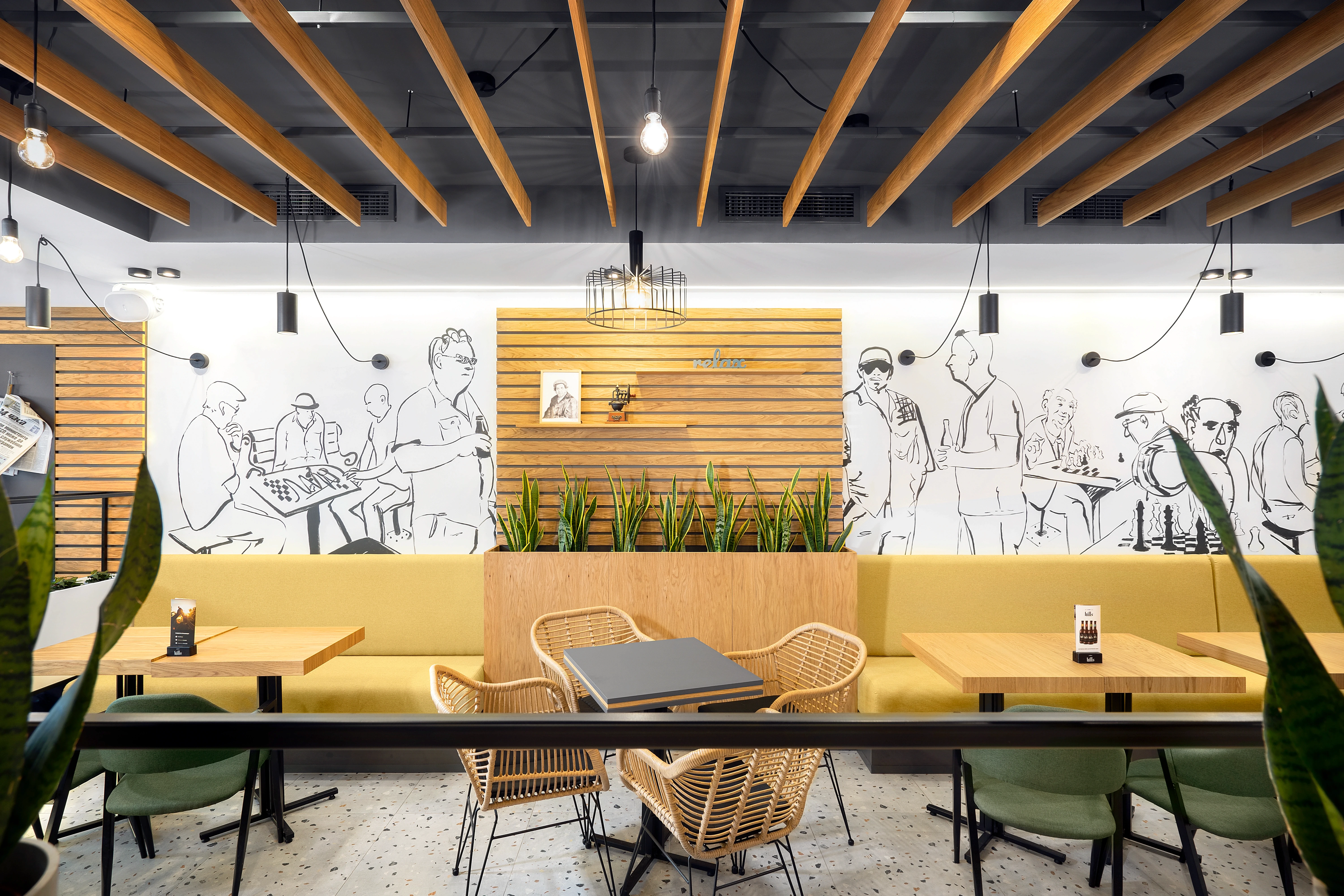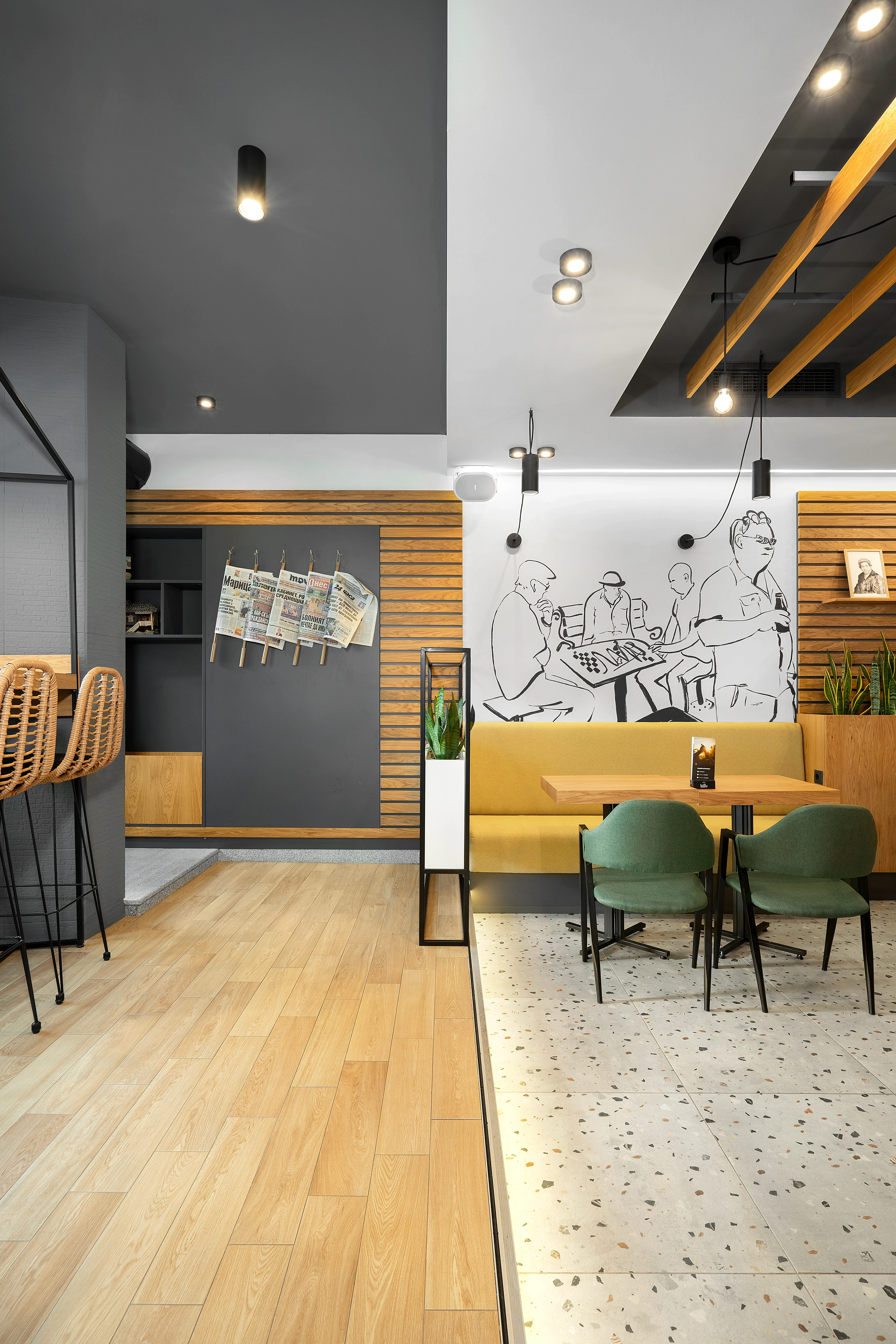 Съвременният прочит на този дух задава и лайт мотива на проекта за интериорен дизайн. Знаменитият пловдивски “айляк” намира своето отражение в небрежно грубите мазилки по стените, избелелия паркет и множеството култови, протрити от четене книги по рафтовете в заведението. Намигването към традиционните за градската среда пейки, кашпи, оголени крушки и лампи, надвисващи от стените, допълва характерната атмосфера на “Дъра-Бъра”.