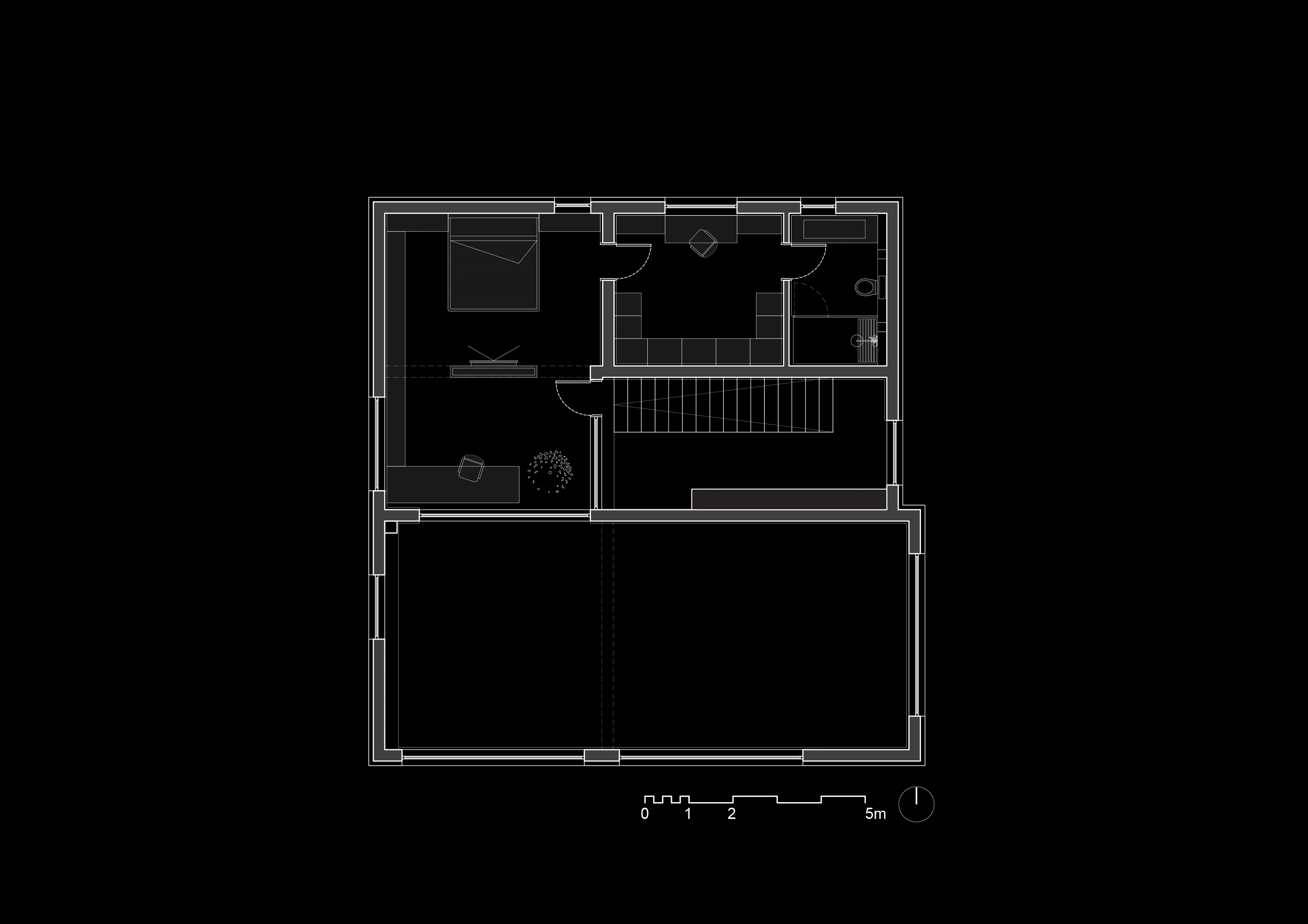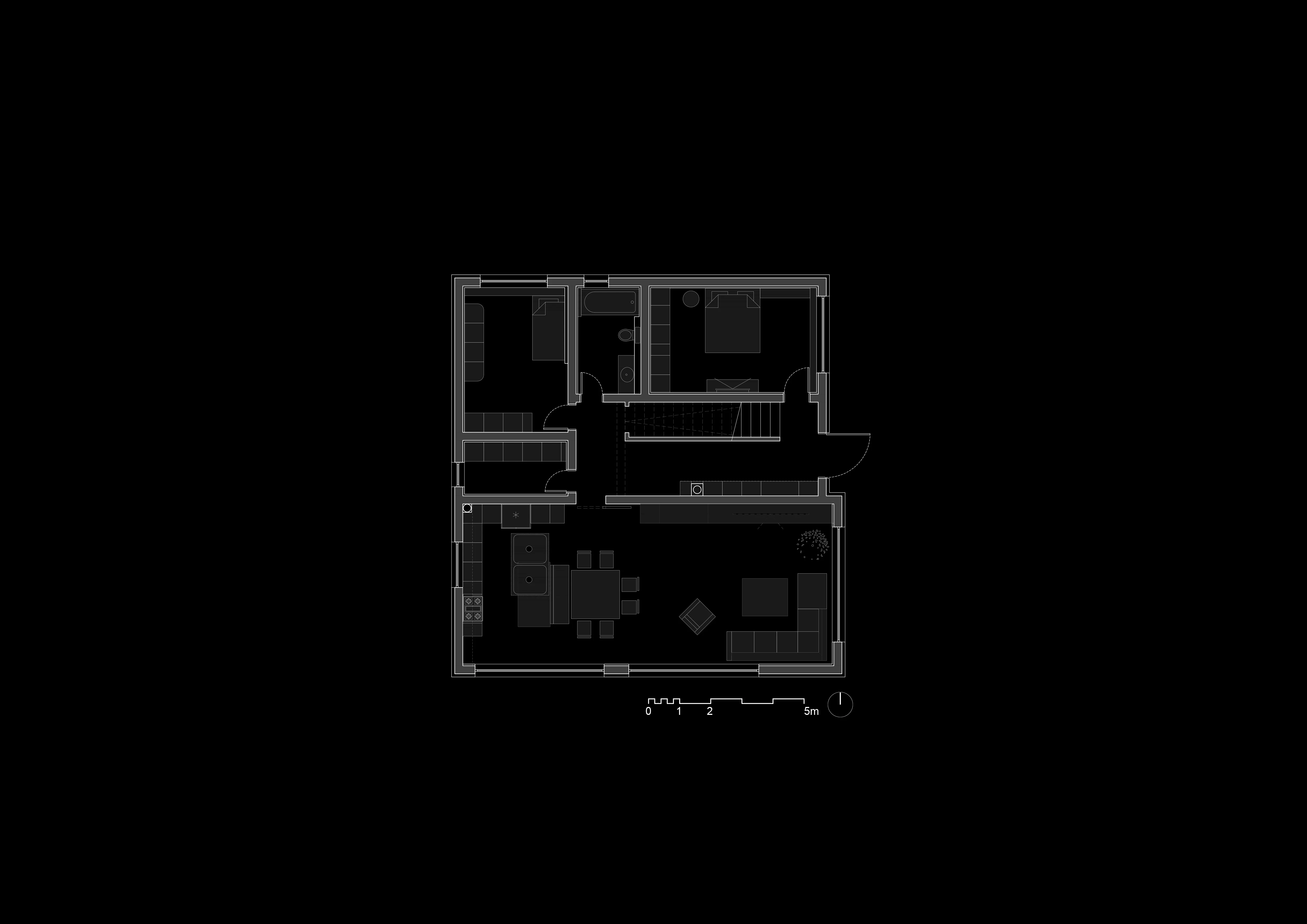 Проучването беше фокусирано върху архитектурните дадености на сградата: двойната височина на дневната и вътрешният прозорец от спалнята. Анализирахме как да използваме тези елементи за максимално проникване на светлина и създаване на визуален диалог между двата етажа, постигайки усещане за отвореност.
