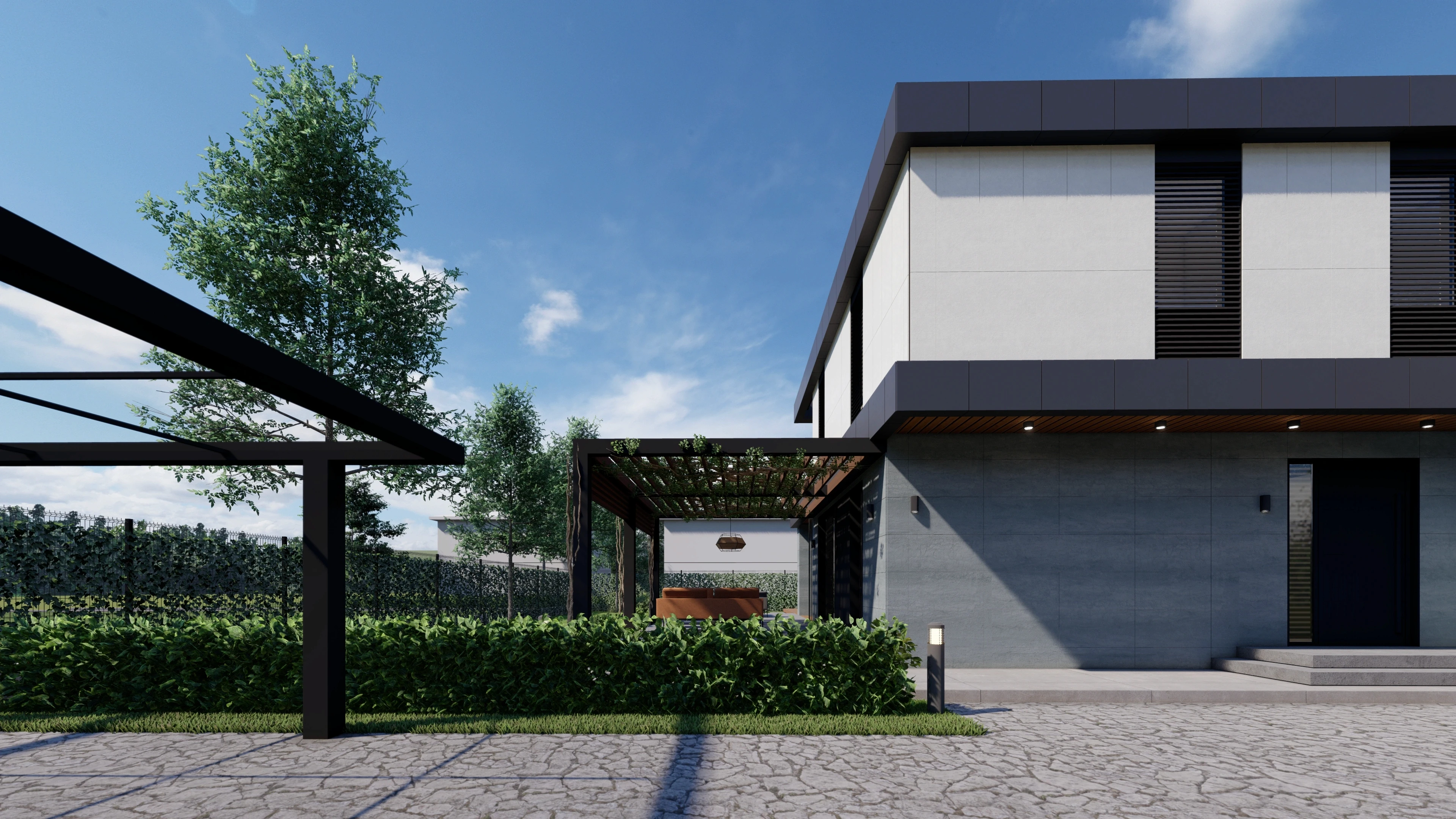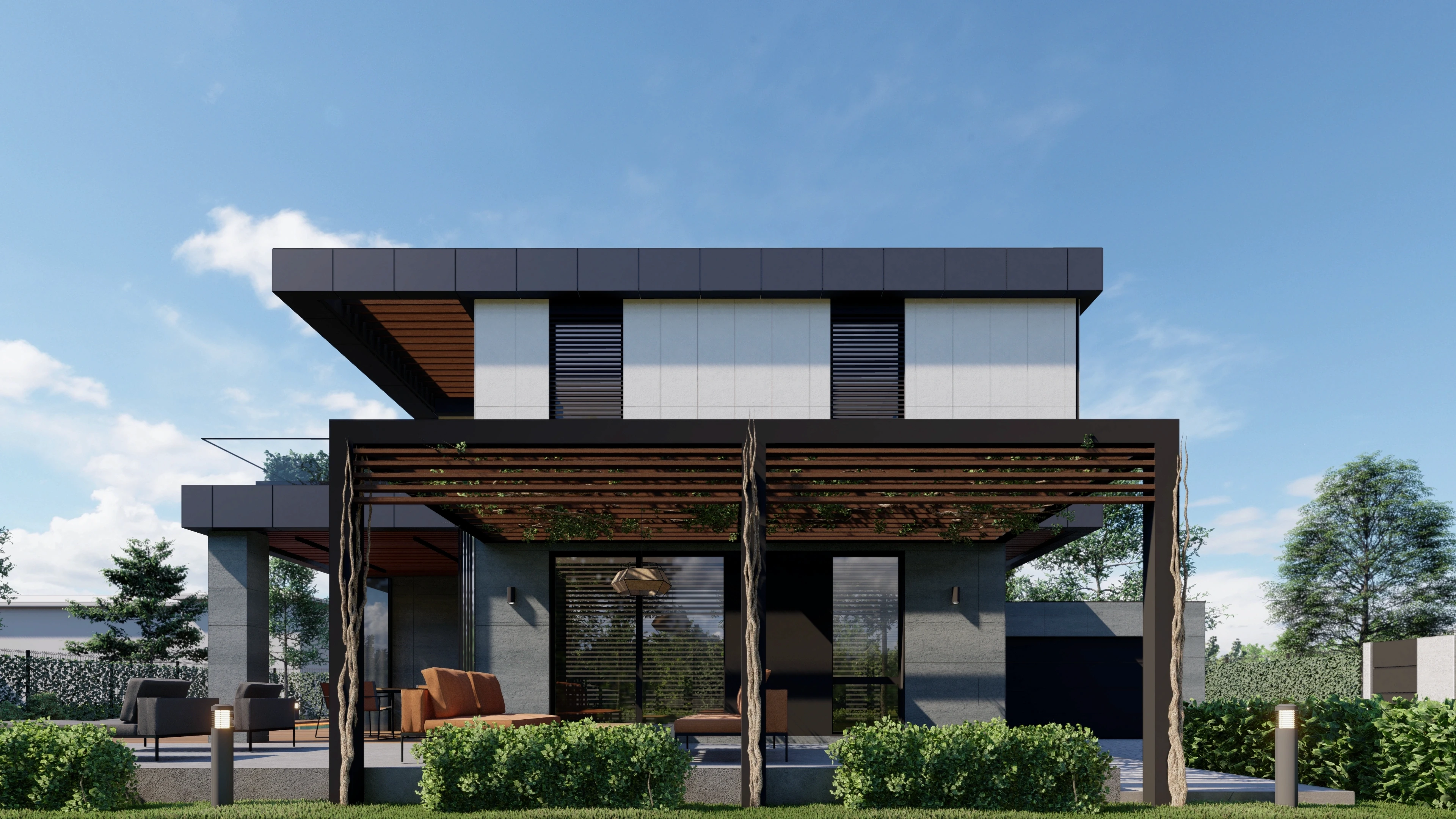 Категоричните и дори строги линии и подборът на материали с естествено излъчване допринасят за модерния характер на къщата. Цялостният облик е завършен от декинги и градински перголи, които образуват допълнителни зони в двора.