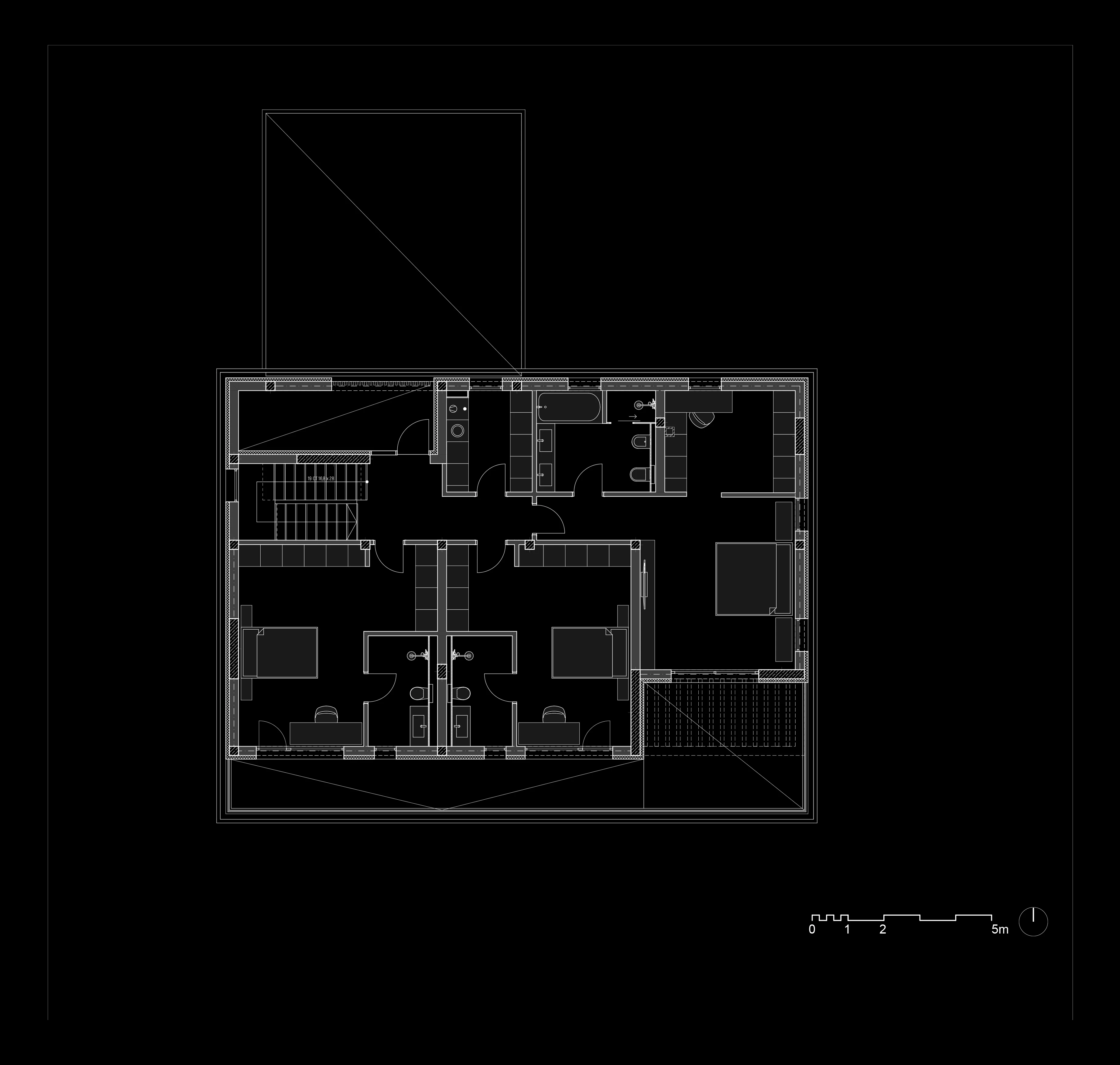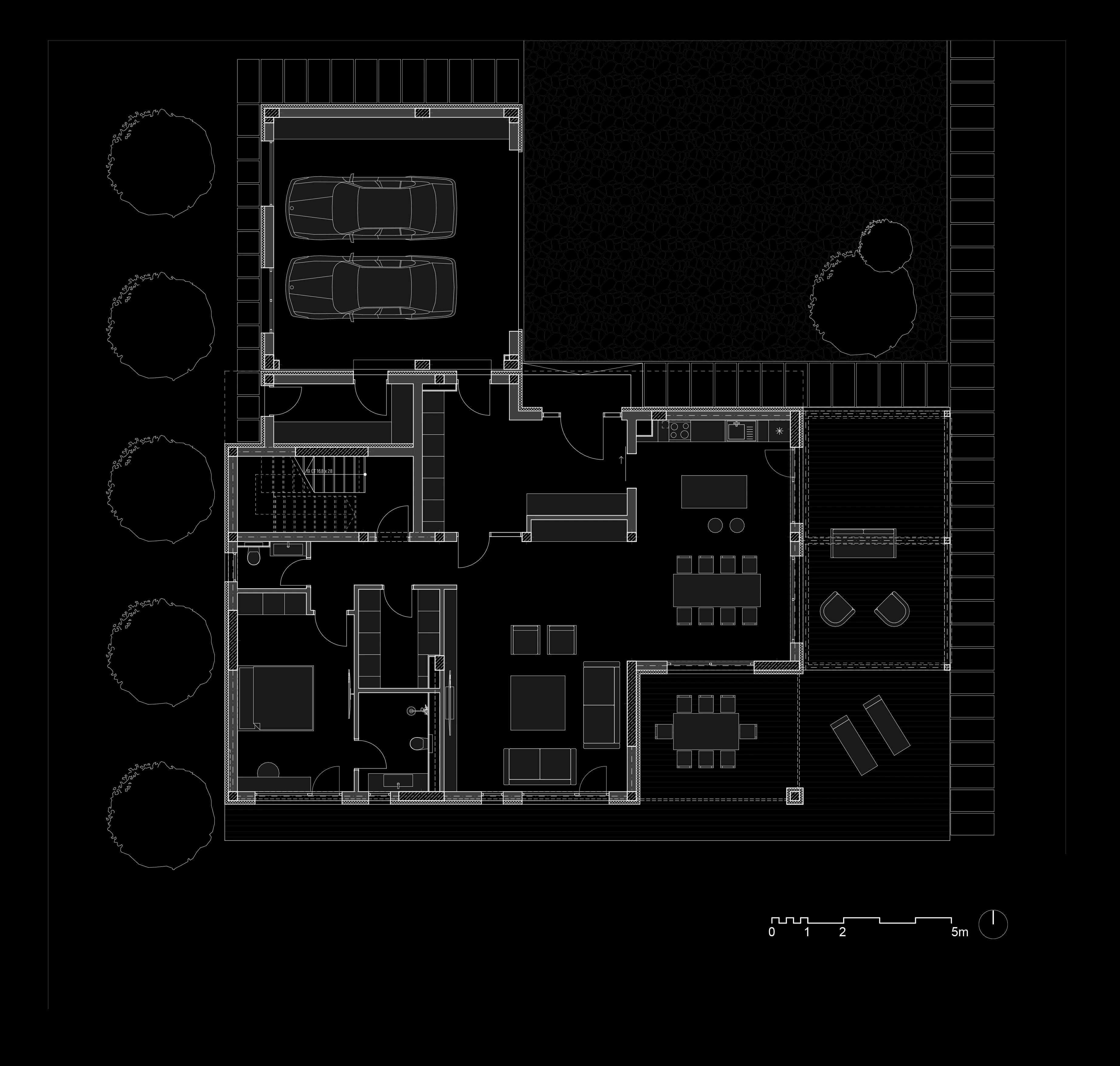 Докато северната е отредена за подход към къщата, паркиране и обслужване, то в южната се разгръща богато озеленен двор, веранда и басейн. Разделянето на имота оставя отпечатък и във функционалното решение на къщата, като четирите спални и двневната са ориентирани към южната зона, а всички обслужващи помещения – към северната.